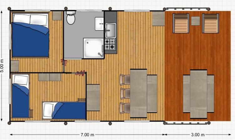 Hieronder vind je een beknopt overzicht van de inrichting die je kunt vinden in de Villatent XL met sanitair. (Bekijk ook de complete inventarislijst.)