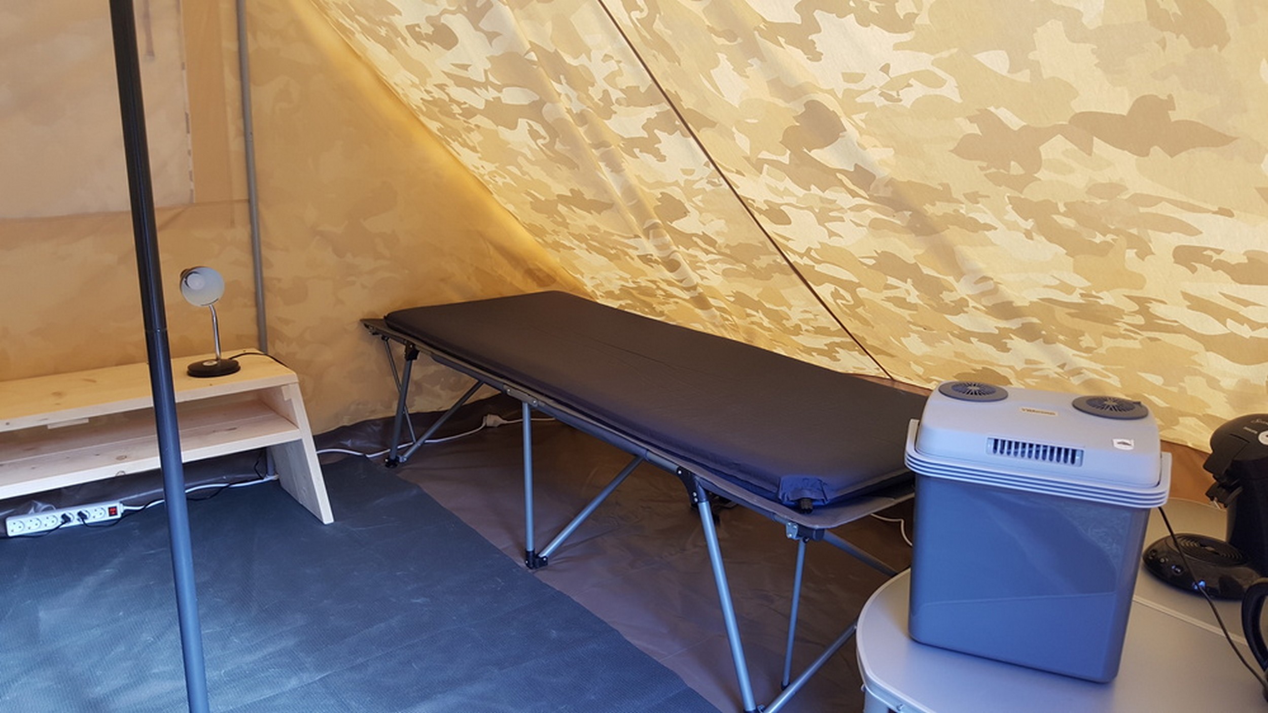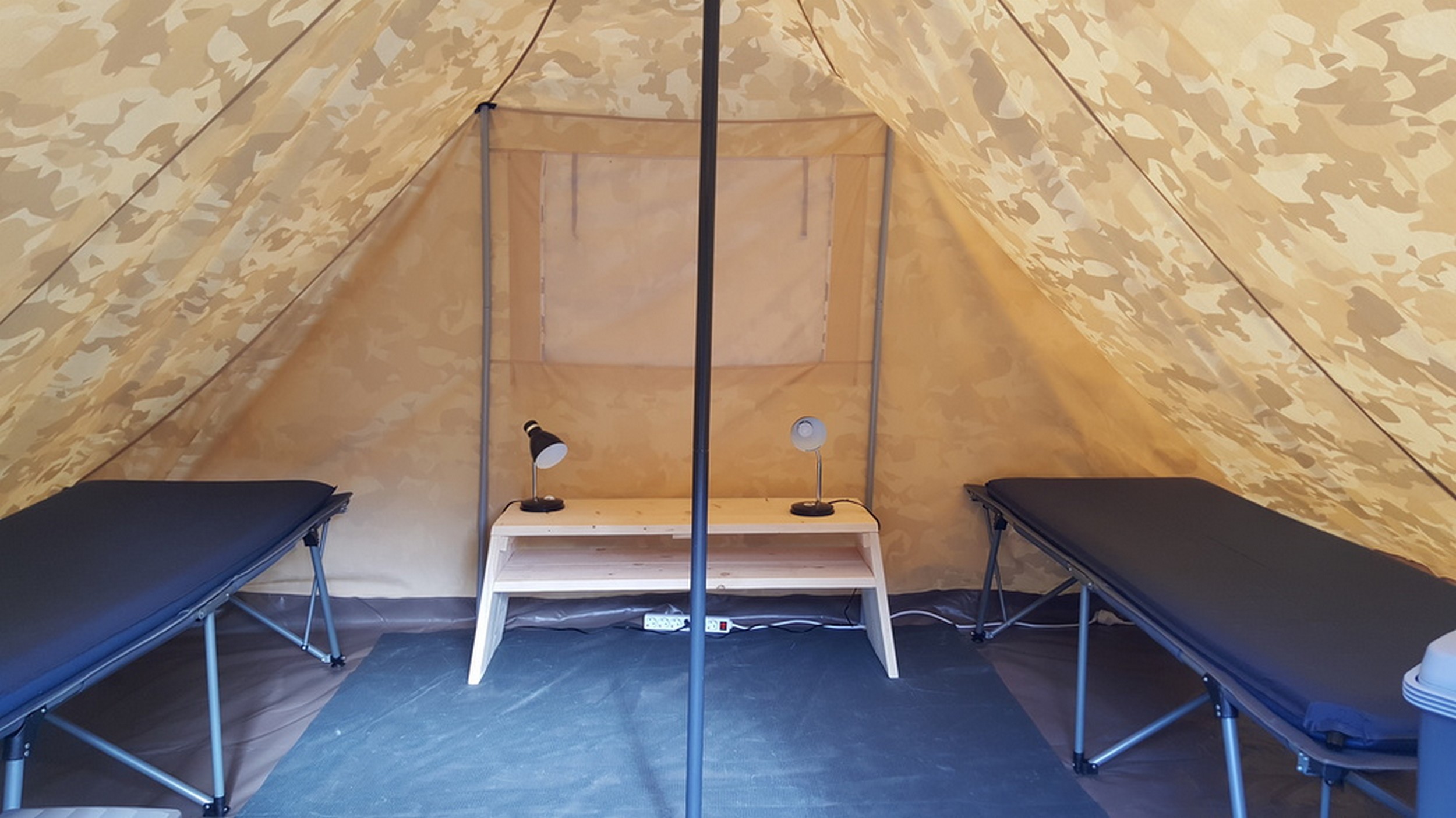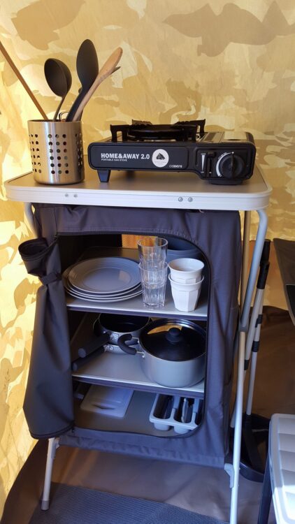 De 3 hoteltenten zijn ingericht als ruime hotelkamers. De vloeroppervlakte van de tent is 3,50 x 4,00 m. met overal voldoende stahoogte. De totale inrichting is als een hotelkamer zonder sanitair. De tent biedt overnachtingsmogelijkheden voor 2 personen inclusief kasten. De afmetingen van de bedden zijn lxbxh 210x80x60 cm. De bedden zijn voorzien van matras. (Zelf kussen/slaapzak etc. meenemen.) De voorziening is gericht op ontbijt, koffie, thee en drankjes. Voor het eten is er een zitgelegenheid buiten. Deze vorm van kamperen is met name geschikt voor trekkers, mensen die een alternatief voor hotelkamer zoeken in de natuur, gezinnen met kinderen die een eigen tent willen voor slapen, chillen e.a. Voor sanitair wordt gebruik gemaakt van de sanitair voorzieningen van de camping. Koken doe je buiten.